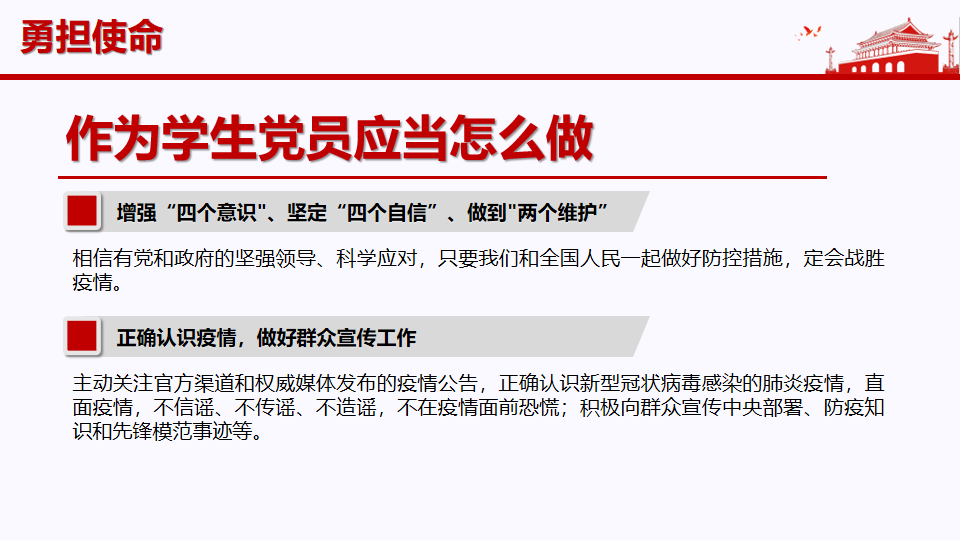 抗击疫情最重要的是落实行动。支部组织委员林昕雨在分享个人做法时谈到,面对疫情最重要的是团结一致,共克难关,作为学生党员,我们在做好个人防护的同时,更应该为社区、为学校、为群众出一份力,例如通过拍摄视频宣传防疫知识、分享先锋模范事迹、提供必要的心理辅导和沟通交流、投身体温监测点或社区服务中心等志愿服务工作等。