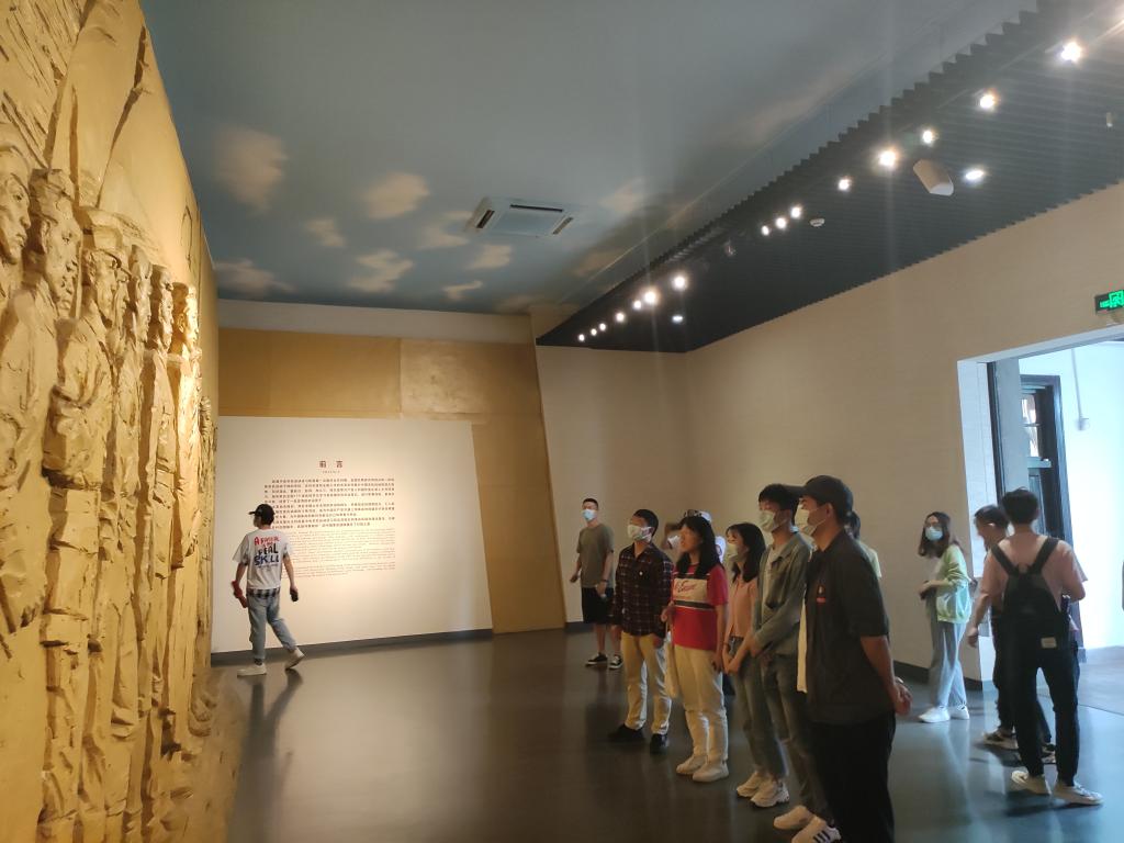 我们来到二楼的纪念博物馆,探索与奠基五个大红字夺目而来,支部成员便驻足参观与思考,他们面对的是刻画在墙上的毛泽东同志与学员们,仿佛当时农讲所中发生的各种学习生活情景扑面而来。