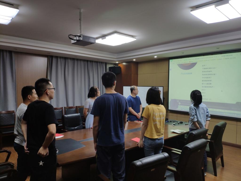 首先,王婕同志介绍了本学期“不忘初心,、牢记使命”主题教育的工作计划以及本次会议的主要内容和相关流程并带领大家唱国歌、宣读入党誓词。随后,王婕同志带领党支部学习《习近平关于“不忘初心、牢记使命”论述摘编》,重点学习第一章节部分:中国共产党人的初心和使命,就是为中国人民谋幸福,为中华民族谋复兴;然后,党支部全体党员以及入党积极分子认真学唱了歌曲《我和我的祖国》,并观赏了《开国大典》、《我们走在大路上》片段。