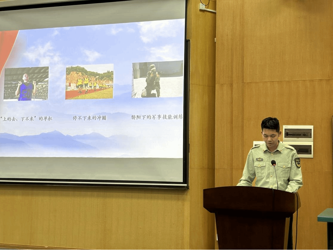 最后,大学生退伍士兵夏鑫诚同学作军旅生活专题分享。他分享了入伍期间的经历与感受,并鼓励同学们面对学业挑战要保持勇气与信心,锤炼胆气血性,以积极心态直面困难。