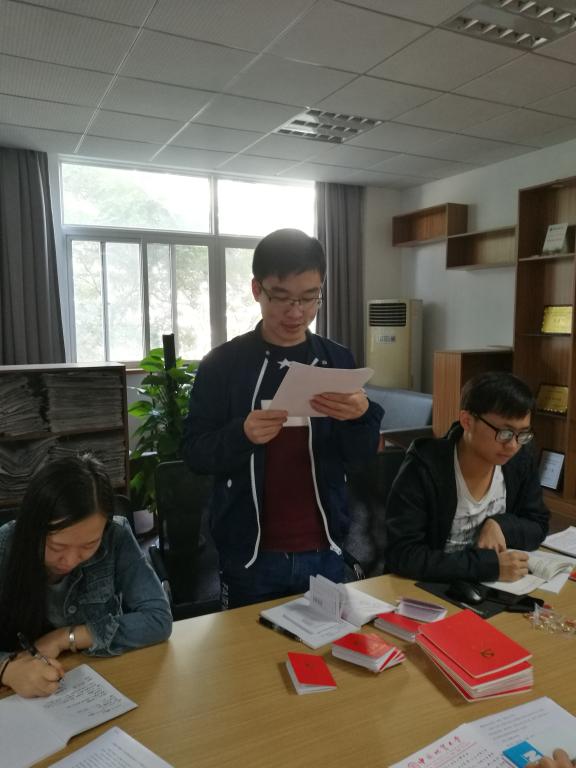全体参会人员在党支书带领下一起学习了《中国共产党章程(修正案)决议》。然后王雪芬同志、王晋超同志、周文奇同志在会上分享了各自学习十九大报告的心得体会。最后,在党支书李凡的带领下,进行了理论知识点回顾,重点回顾了党的行动指南、“五位一体”总体布局、“四个全面战略布局”、“两个一百年”等重要内容,在场党员都积极回答相关提问。