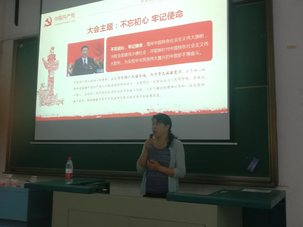 (通讯员 栾淑惠)2018年4月20日下午四点,18影片 分党校第八期入党积极分子培训班党课第七讲在教三楼208举行。本次党课的主题是“学习贯彻党的十九大精神”,主讲人是机电学院党委书记王海花老师。