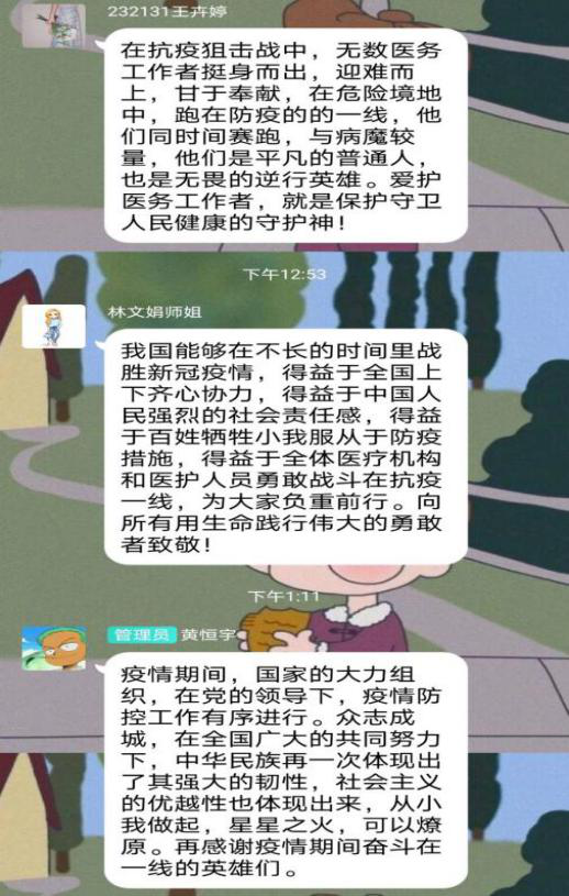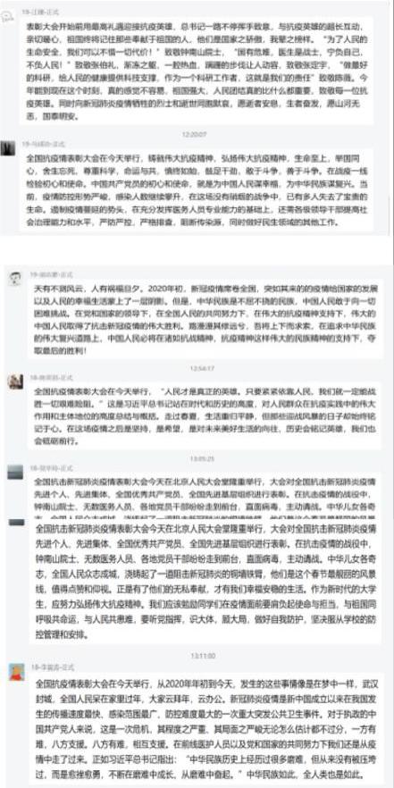 各学生支部在观看了表彰大会直播后,在学生群里展开了热烈讨论,积极发表自己的感想。作为当代青年的我们,要积极学习抗疫英雄们甘于奉献的精神,正如钟南山院士所说“生逢盛世,当不负盛世”。作为学生党员的我们,更应该不忘初心,牢记使命,勇往直前,做好科研工作的同时为国家和社会贡献出我们自己的力量。