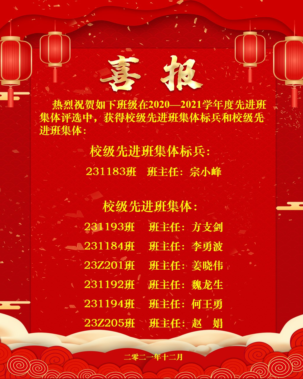 根据《关于做好2020-2021学年度先进班集体(标兵)评选工作的通知》、《关于开展2020-2021学年先进班集体标兵评审答辩工作的通知》,经过学院自评、学校评审,评定先进班集体标兵(综合奖)20个、先进班集体标兵(单项奖)7个、先进班集体104个,18影片 以下班级获得校级先进班集体标兵、校级先进班集体: