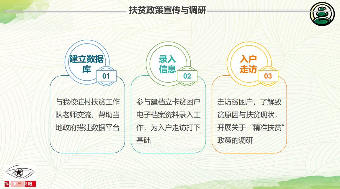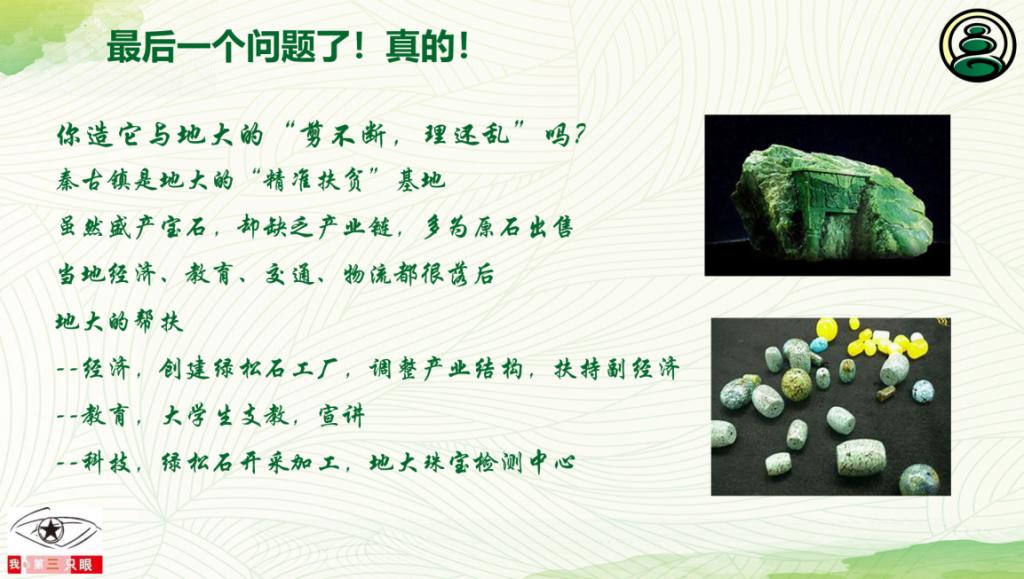 通过地大的帮扶,经济上,小河村创建绿松石工厂,调整产业结构,扶持副经济;教育上,大学生奔赴支教,积极宣讲;科技上,完善绿松石开采加工产业链,地大珠宝检测中心进行帮扶合作。最后由蔡琪介绍成果,团会在一片积极向上的气氛中结束。