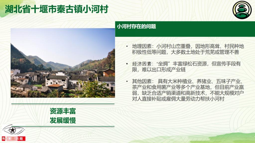 然后由王静介绍灯芯团队之“助力精准扶贫”,对点扶助对象是湖北省十堰市秦古镇小河村,那里资源丰富但是发展缓慢。虽然盛产宝石,却缺乏产业链,多为原石出售,当地经济、教育、交通、物流都很落后。