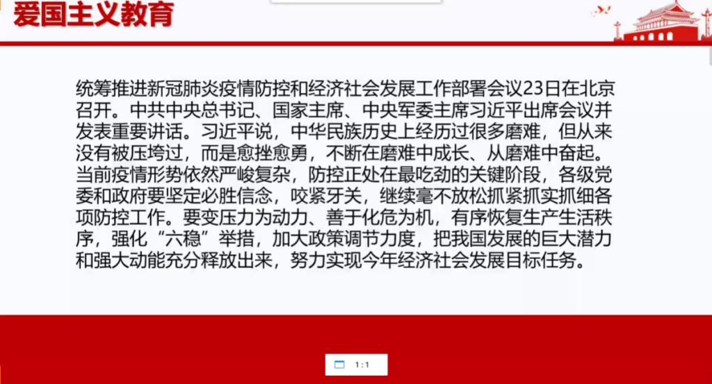 然后开始对2020年2月23日习近平总书记在统筹推进新冠状肺炎疫情防控和经济社会发展工作部署会议上的讲话做出核心内容的讲解。团支书将其分为三大点:关于前一段疫情防控工作;关于当前加强疫情防控工作;关于统筹推进疫情防控和经济社会发展工作。主持人指出‘此次疫情是一场危机,也是一场考验’,;‘防控工作取得的成效,再次彰显了中国共产党领导和中国特色社会主义制度的显著优势’。对于第三点总结为“推动复工复产五个‘关系’”,“用 全面、辩证、长远的眼光看待我国发展”“增强信心、坚定信心”。并且讲述总书记转赴武汉考察疫情防控工作,并指出要搞好武汉人民的生活质量,不能出门但是生活水平也不能下降,不能搞虚假,要实事求是让人民生活好。还指出总书记说湖北是这次疫情防控的重中之重和决胜之地,指出虽然目前有好转但还不能松懈,丝毫不能放松再接再厉。