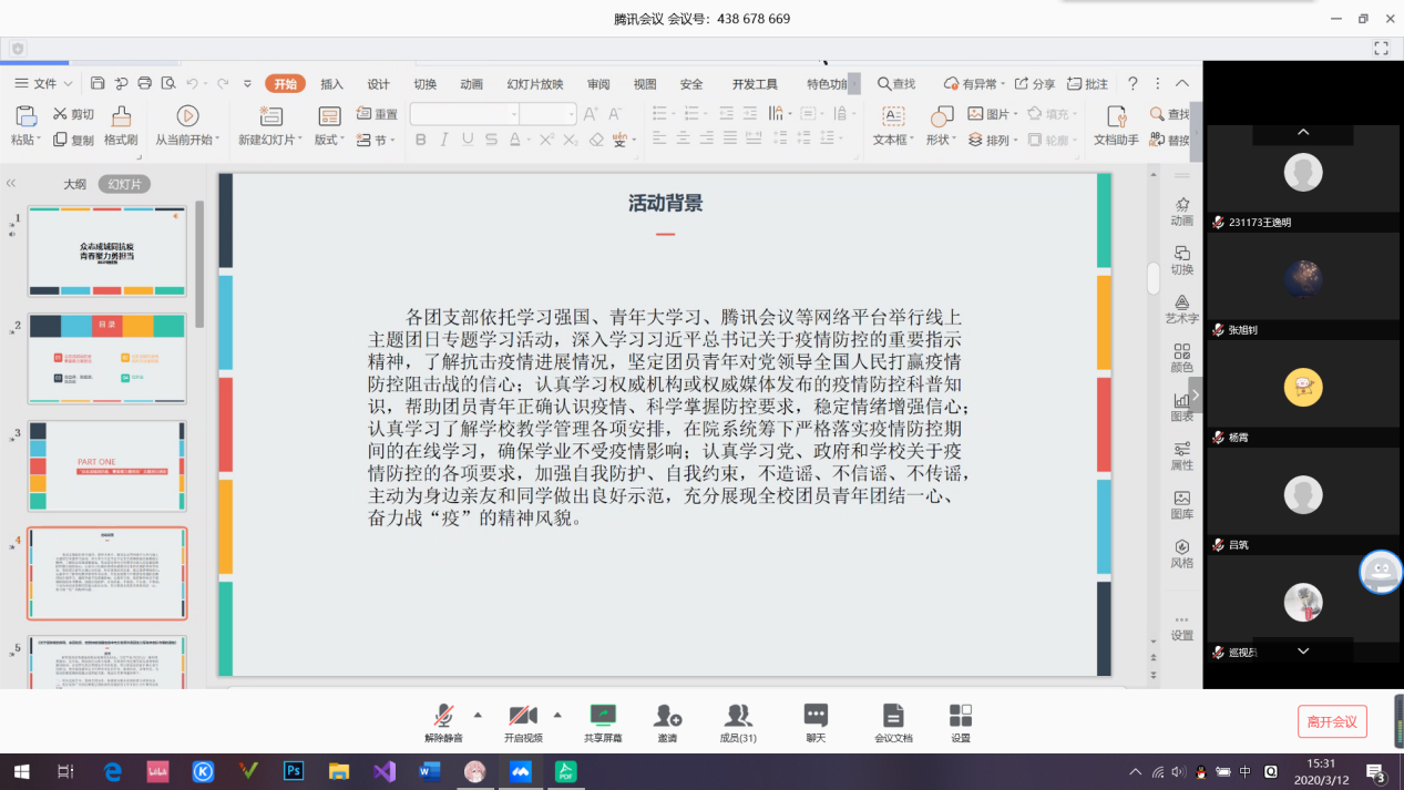 2020年3月8日,232181班于腾讯会议召开网上主题团会“众志成城同抗疫 青春聚力勇担当”。232181班应到30人,实到 30人。