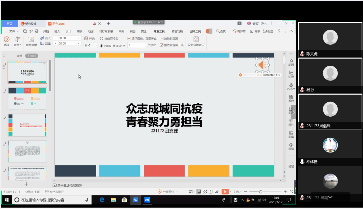231173班3月12日通过线上会议(腾讯会议)召开了“众志成城同抗疫 青春聚力勇担当”主题团日活动,231173班全部同学及班主任参与团日活动,该团日活动由团支书张丰昱组织开展。