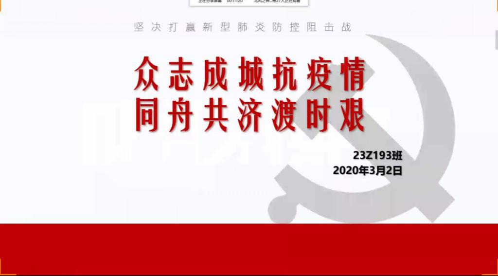 23z193班团支部“众志成城同抗疫,青春聚力勇担当”主题团会于3月2日通过网络线上举行。本次团会以如今疫情联防联控进入攻坚时期为背景,号召同学们能够跟随党的步伐,在这个特殊时期做好疫情预防工作,了解当前形势,共同打好这场防疫保卫战。