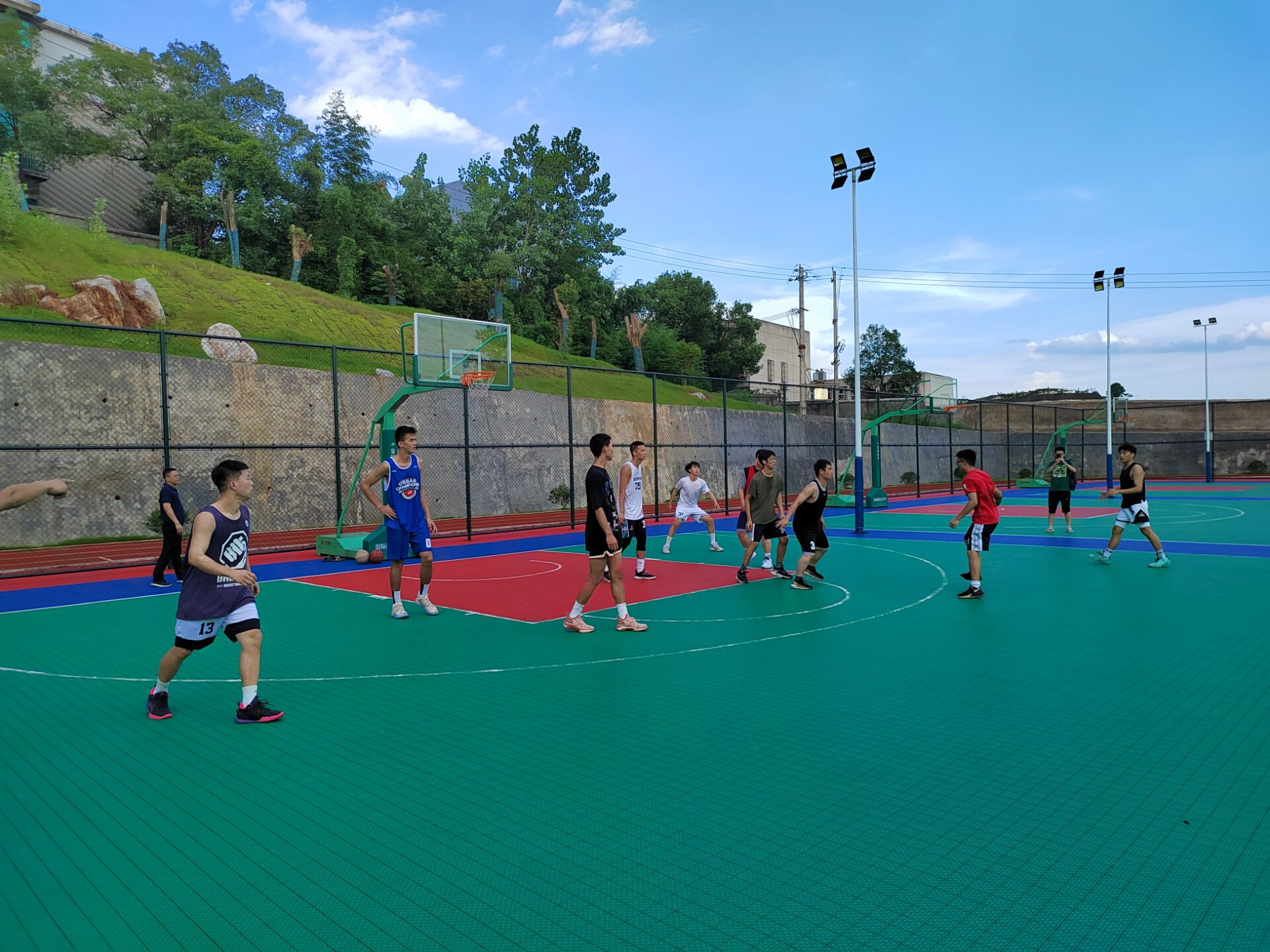 实习师生与湘潭大学实习师生组织了一场篮球比赛。燥热的天气没有阻挡同学们的热情,大家踊跃报名,教师代表陈略峰、胡杰、王峰与学生努尔扎提等作为我方主力参赛。随着裁判哨声一吹,球向上扔出,参赛队员们高高蹿起,开启了一场惊心动魄的篮球比赛。最终,比赛以80比78结束,18影片