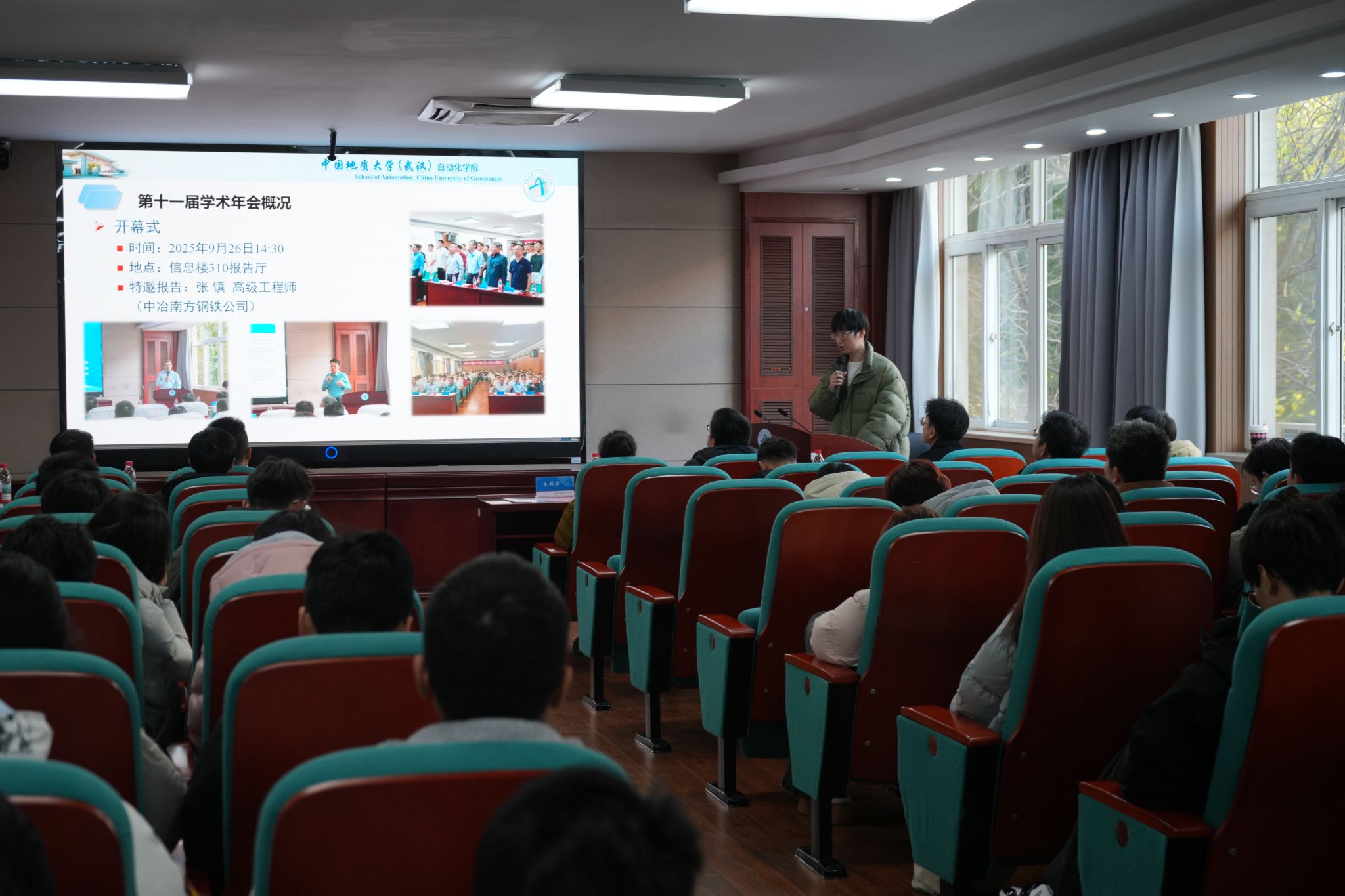 学院研究生会主席团成员谢作晨作年会总结。今年9月学术年会开幕以来,先后邀请重庆大学、伊斯法罕理工大学、加拿大阿尔伯塔大学、日本东京大学等国内外知名高校的专家学者作专题学术报告,8位归国博士生分享留学期间的学术研究与学习见闻。举办研究生科技论文报告会6场次,22位研究生导师参加评审研究生论文173篇,9篇论文获得校一等奖。在学术年会浓厚氛围的熏陶下,学院研究生积极参加学术活动、拓宽学术视野,在各自研究生领域中取得丰硕成果,2025年,研究生赴美国、韩国、新加坡等地参加国际会议12人次,累计发表304篇期刊论文(其中控制领域顶级期刊11篇、SCI论文218篇),申请发明专利77项、软件著作权48项,在国创赛、挑战杯、研电赛等高水平双创赛事中获省部级以上奖励37项。