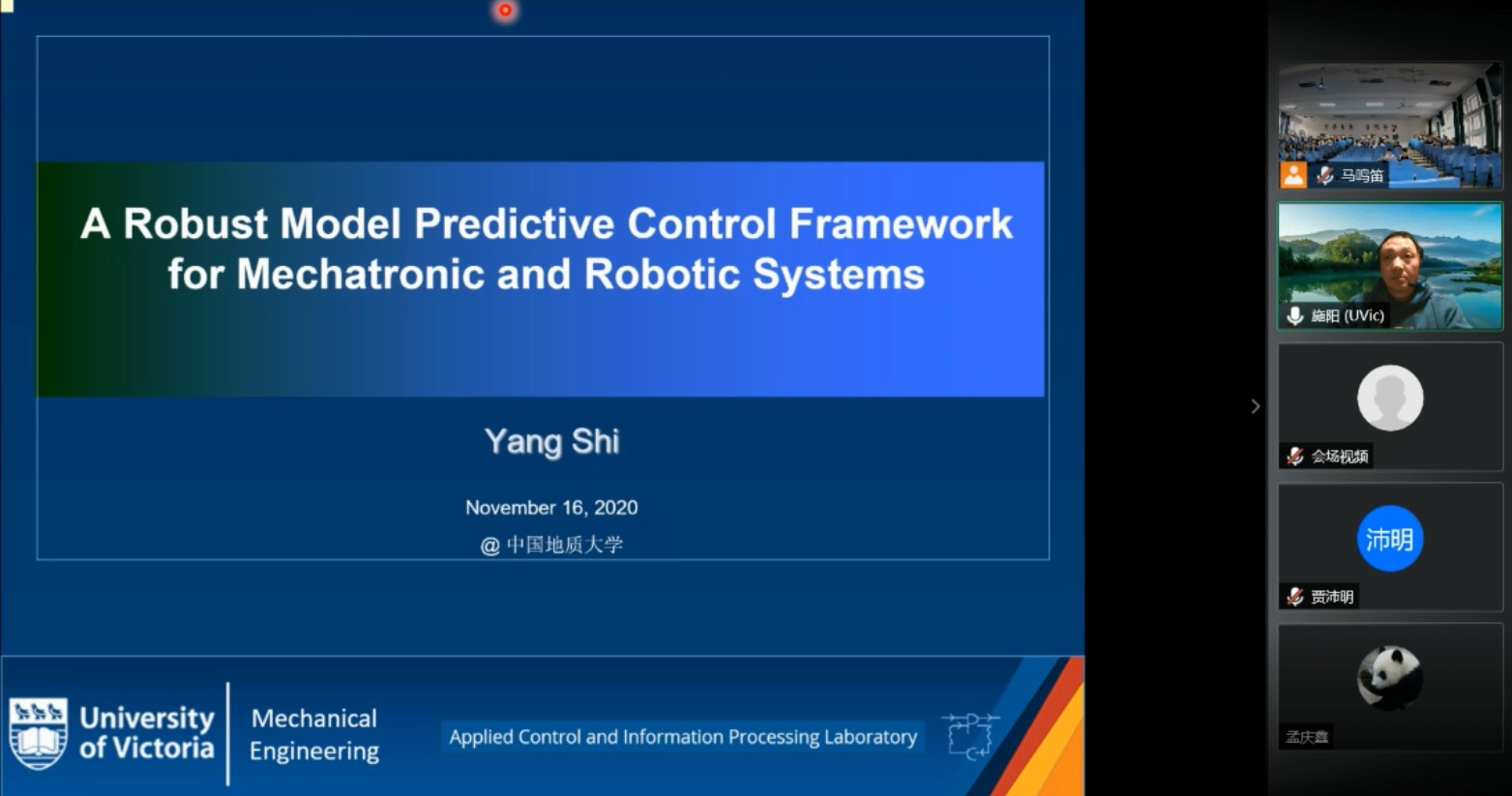 11月16日,第二场主题为A Robust Model Predictive Control (MPC) Framework for Intelligent Mechatronic Systems,加拿大维多利亚大学施阳教授主讲,通过总结智能机电系统在设计、实施、部署和操作方面的主要应用需求和创新挑战,重点讲授MPC算法在智能自主水下机器人(AUV)中的应用。