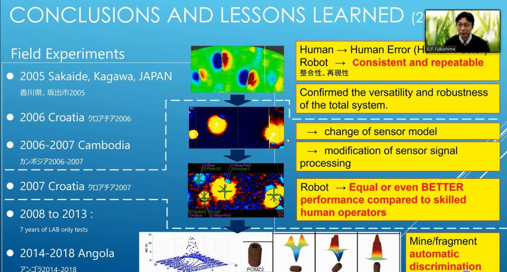 11月13日,第一场主题为Humanitarian Demining Robot Research at the Land Sea Air Mobile Robotics Laboratory,日本东京工科大学福島E.文彦教授主讲,重点讲授在许多受地雷影响的国家进行试验的人道主义排雷机器人的研制情况。