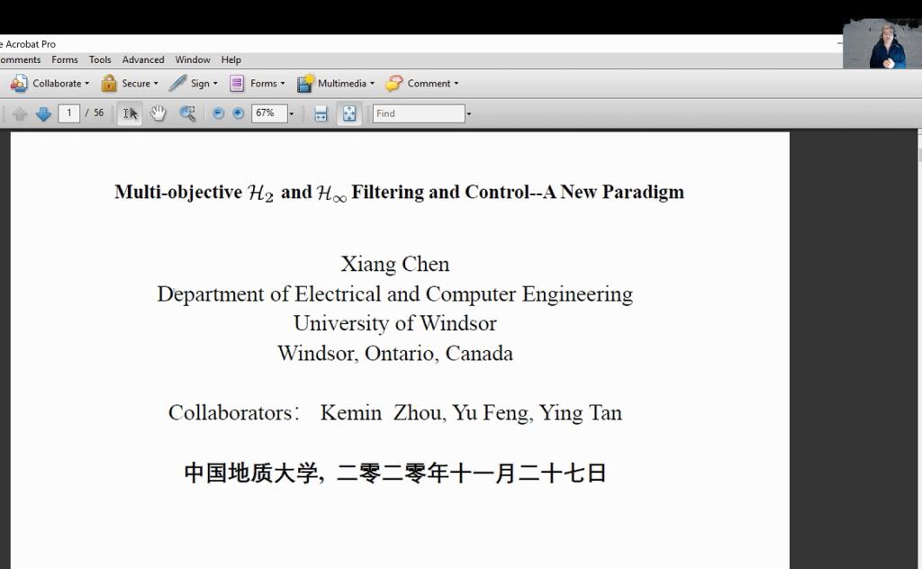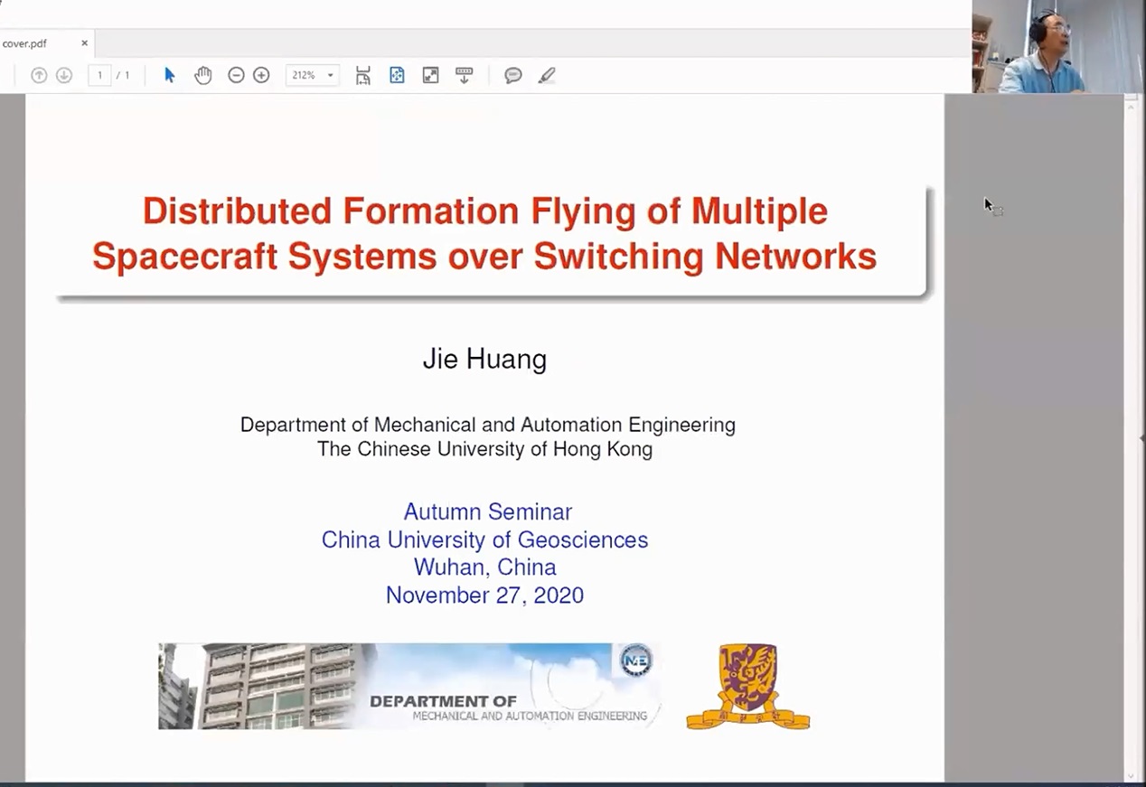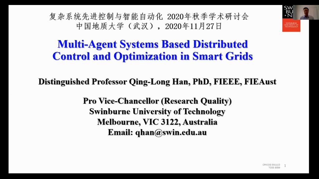 11月27日,“2020复杂系统先进控制与智能自动化秋季学术研讨会——杰出学者报告会”第二场随后举行。澳大利亚斯威本科技大学韩清龙教授作了题为《Multi-Agent Systems Based Distributed Control and Optimization in Smart Grids》的学术报告,香港城市大学谢旻教授作了题为《Safety and Reliability of AI Systems–Some Challenging Issues》的学术报告,香港中文大学黄捷教授作了题为《Distributed Formation Flying of Multiple Spacecraft Systems over Switching Networks》的学术报告,加拿大温莎大学陈翔教授做了题为《Multi-objective H2 and H∞ Filtering and Control--A New Paradigm》的学术报告,香港中文大学陈本美教授作了题为《Research Trends in Developing Intelligent Unmanned Systems》的学术报告。
