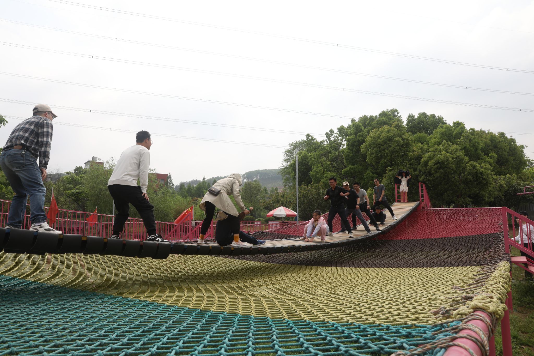 午饭过后,雨过天晴,大家乘车来到九真桃源。这里可谓是孩子们的天堂!毛茸茸的小兔子让小朋友们纷纷围观,又是喂胡萝卜,又是喂青菜,老师们的童真心也被调动起来,纷纷直呼可爱。还有美丽的花孔雀,踱着优雅的步子跟大家展示它们的美丽。成群的和平鸽,不停地跟大家互动,一会飞到大家手上,一会又停在大家肩上。最让人爱的莫过于网红桥了,老师和孩子们看到后纷纷加入,不一会就分成两队,然后大家都开始快乐地摇摆!