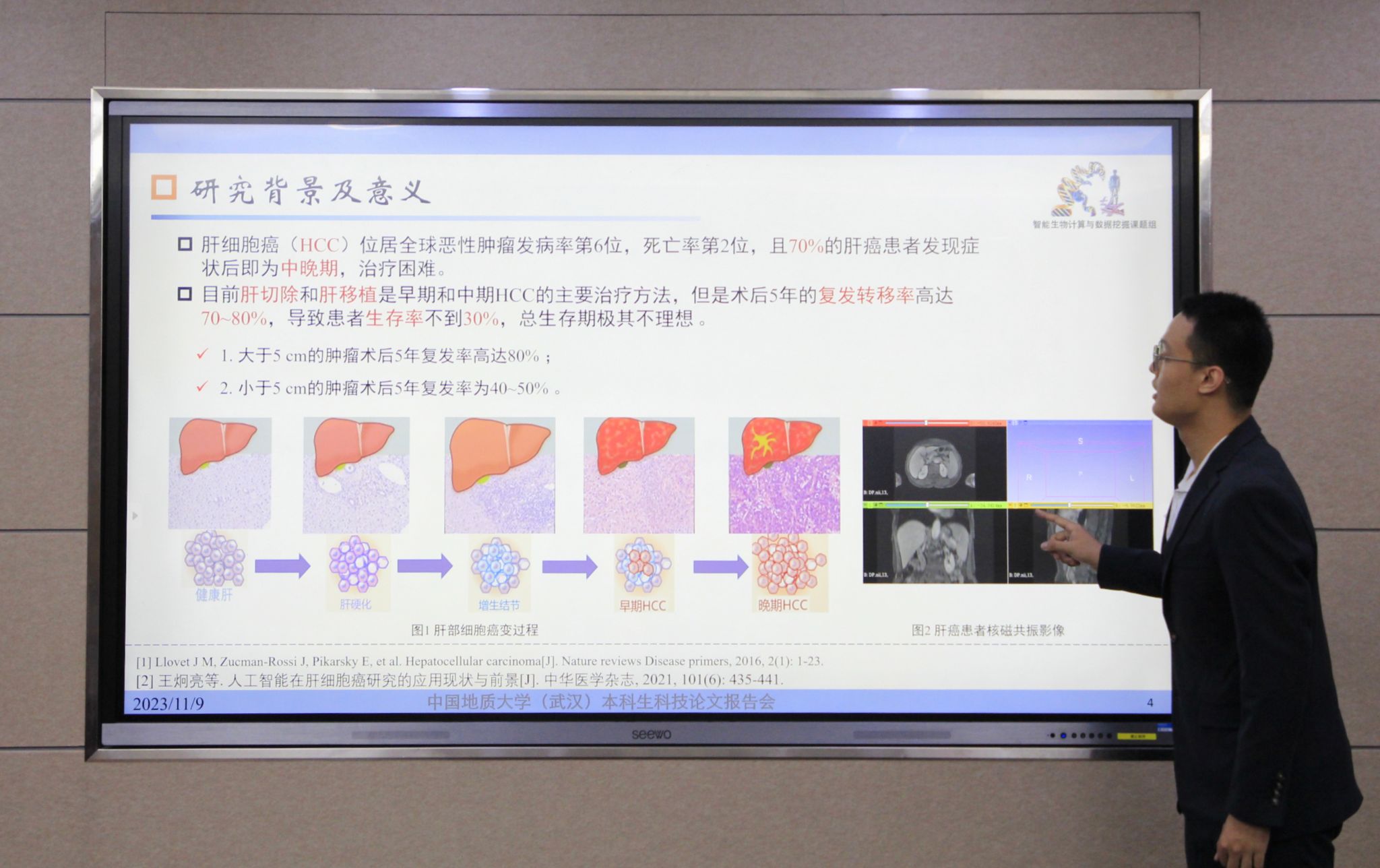 本届科技论文报告会共26个团队报名参与,汇报采取“5+3”的答辩模式,内容涉及人工智能、自动驾驶、机器人设计及钢铁冶炼等多个领域,展示了本科生在理论研究与实践创新的探索与进展。其中马海书团队基于多序列深度融合MRI来预测肝癌微血管侵犯,为肝癌的诊断和治疗提供了新的思路和方法,王新宇、孙德科团队分别就无人自行车设计和无人小车控制方案设计汇报了研究进展,李想团队则回顾了铁矿石烧结过程质量和产量指标预测的研究进展,并提出了自己的研究思路。