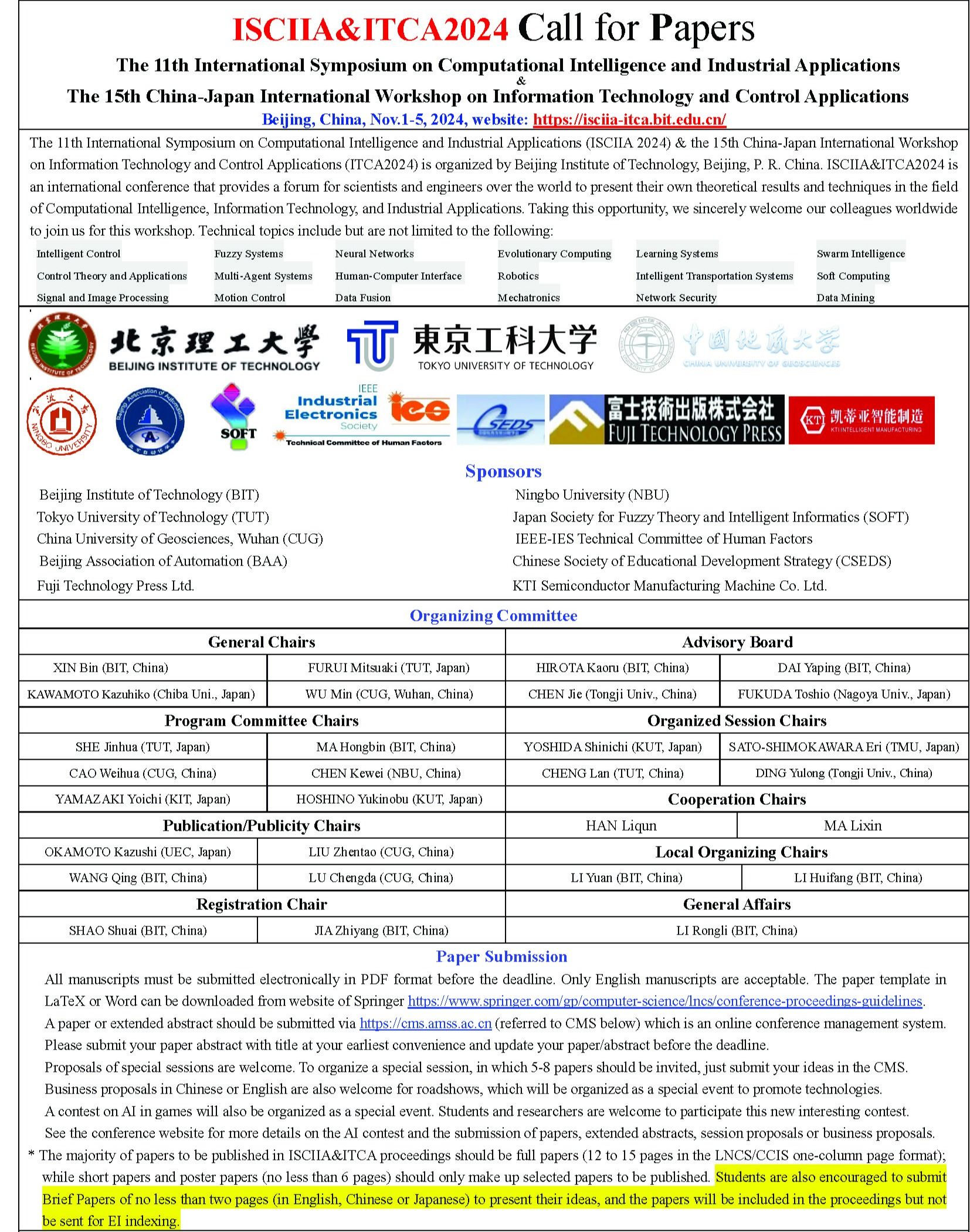 由18影片 (武汉)、北京理工大学和日本东京工科大学主办的11ISCIIA2024和第15ITCA2024联合国际会议将于2024111日至5日在北京召开。欢迎大家踊跃投稿。详情请见会议网站://isciia-itca.bit.edu.cn/