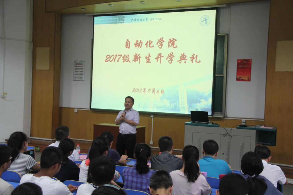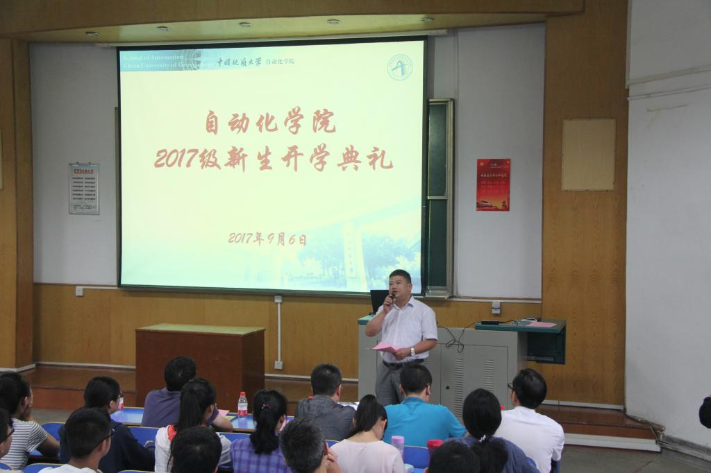 全体教师对2017级新生的到来表示热烈的欢迎。接着他为即将到来的第37届中国控制会议作志愿者动员讲话。他向新生们详细介绍了学院的专业设置、教学科研平台以及办学特色,并对广大新生提出了几点殷切希望:第一,要尽快适应大学生活,实现由高中生到大学生的角色转换;第二,要树立远大的理想目标,志存高远,要规划好自己的大学生活;第三,要提高自身综合素质,培养学习科研、团结协作、交流表达等方面的能力;第四,要学会感恩,时常感恩父母、感恩师长;第五,要努力学习,在地大拥抱属于自己的青春。