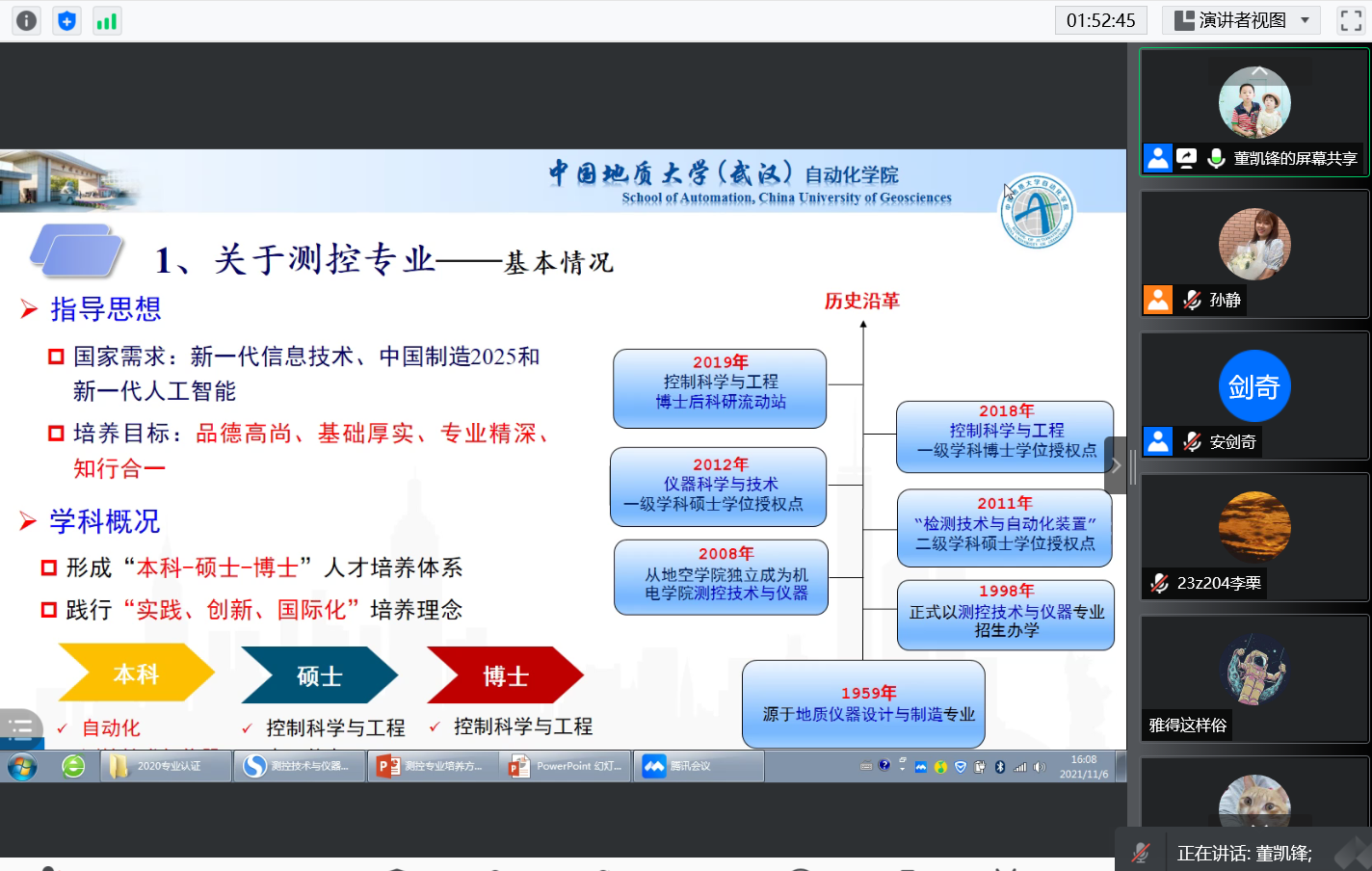 为了更好的帮助20级学生进行专业志愿填报,对学院开设的两个专业方向有充分的了解,2021116日下午15:30,特举办20级专业分流介绍答疑会。本次专业介绍会由辅导员孙老师主持,邀请到了自动控制系系主任安剑奇老师和测控技术与仪器系系主任董凯锋老师参加。