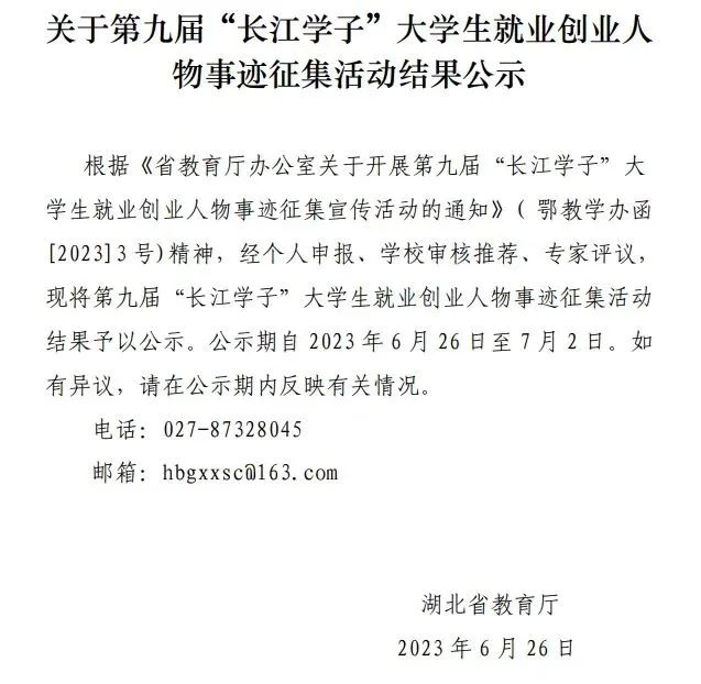 近日,湖北省第九届“长江学子”大学生就业创业人物事迹征集活动评选结果揭晓。经学院推荐、学校推荐、专家推选等环节,18影片 2019级本科生刘学文同学成功获评湖北省自强奋进类“长江学子”称号。