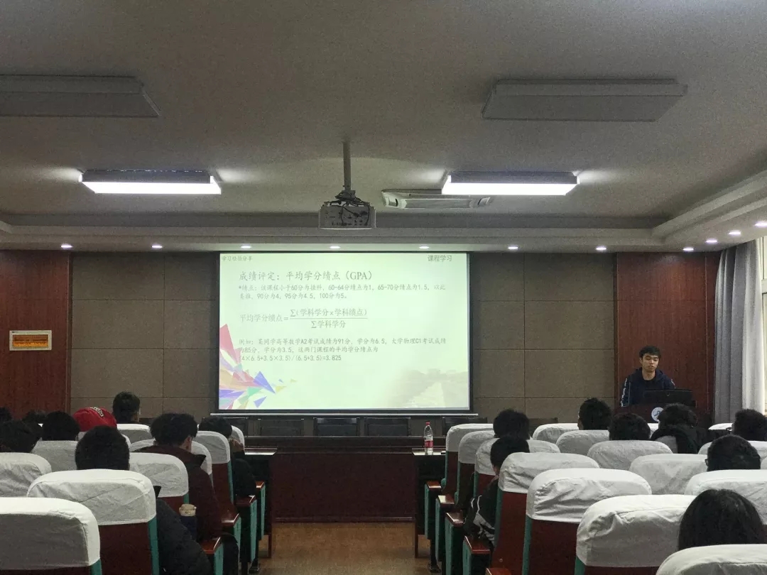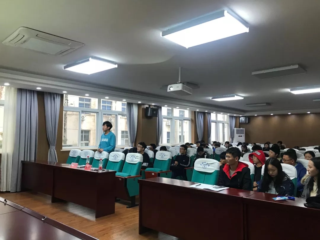 崔炳杰学长主要介绍了关于大学学习生活的规划,告诫同学们端正学习态度,提醒学生们寻找正确的学习方法;同时还强调体育锻炼,在提高学习质量的同时保持良好的身体素质。