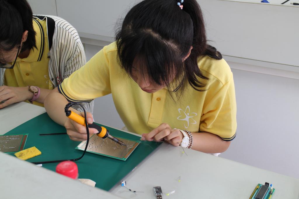 终于到了动手实践的时候,营员们摩拳擦掌都想做出有意义并且美观的作品。在刚刚接触焊接的时候营员们都表现的有些紧张,但是随着时间的推移,大家都开始变得熟练了起来,一颗颗的LED灯,一个个精密的原件在营员的手中慢慢的变得井然有序。第一个流水灯在实验室里亮起时,同学们爆发出喜悦的欢呼。最后大家都顺利完成了自己的作品,这极大地激发起同学们学习的兴趣,在未来去寻觅更深层次的秘密。