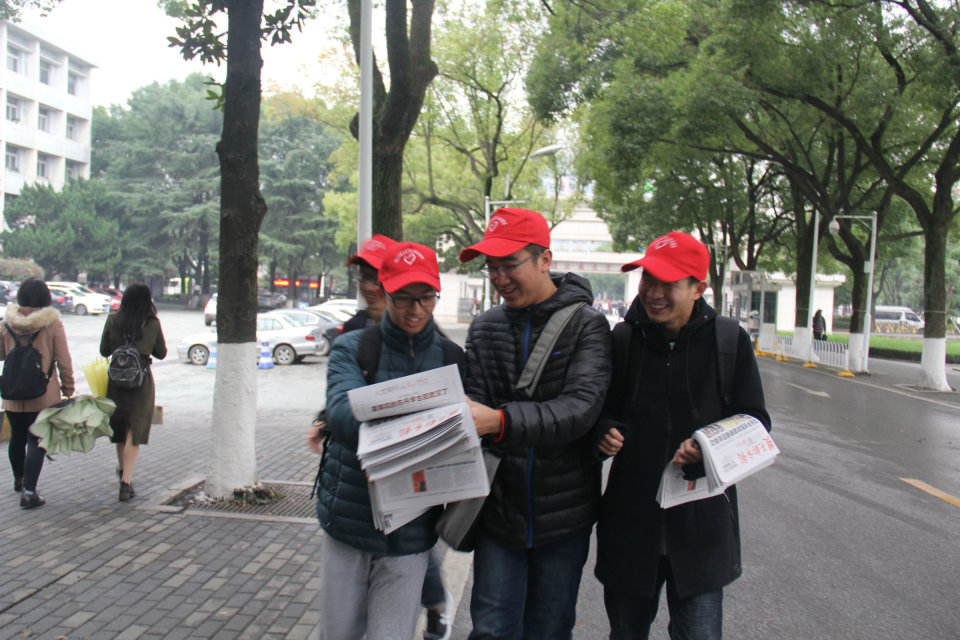 尽管当天天气寒冷,同学们仍在早上七点半准时在校门口集合。八点钟物品分发结束后,全体志愿者戴着小红帽,纷纷出发前往华中科技大学、华中师范大学、光谷步行街等地点进行义卖。同学们用灿烂的笑脸,礼貌地向路人讲解义卖活动及善款用途,活动得到了社会广大爱心人士的积极响应,他们纷纷慷慨解囊。最终义卖报纸2900余份,共筹得善款3301.8元。本次活动中,涌现出了一批表现优秀、贡献突出的“优秀志愿者”和“优秀服务团体”。